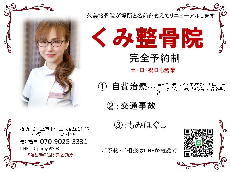 名古屋市中村区で整骨院・整体院をお探しなら、中村公園駅から徒歩1分の「くみ整骨院」へ。