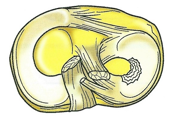 半月(はんげつ)は膝関節の「大腿骨と脛骨」の間にあるC型をした軟骨の板で、内側・外側それぞれがあり、クッションの役割を果たしています。これが損傷しますと、膝の曲げ伸ばしの際に痛みや引っ掛かりを感じたりします。ひどい場合には、膝に水がたまったり、急に膝が動かなくなる「ロッキング」という状態になり、歩けなくなるほど痛くなります。